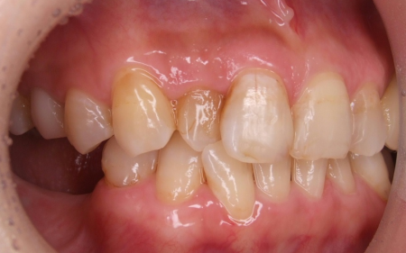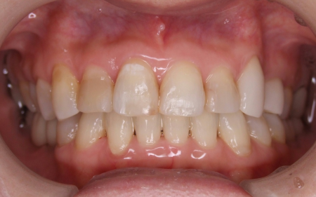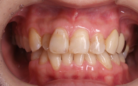 拝見したところ、歯と歯が並ぶ土台の骨「歯槽基底」の大きさの不調和により歯並びがガタガタになる「叢生(そうせい)」が全体的に生じており、また上下の前歯の重なりが深いため下の歯が見えない「過蓋咬合(かがいこうごう)」も認められました。