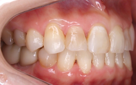 矯正治療が終了した後半年間、要素A要素B要素Dに変化がないか?安定しているか?を観察したあと、左下のインプラント2本(第1大臼歯、第2大臼歯)にはそれぞれ単独の被せ物、右下の奥歯3本(第2小臼歯、第1大臼歯、第2大臼歯)にはインプラントを土台にしたブリッジ、左上の歯3本(犬歯、第1小臼歯、第2小臼歯)には歯の大きさを調整して犬歯と第2小臼歯にそれぞれ単独の被せ物を装着しました