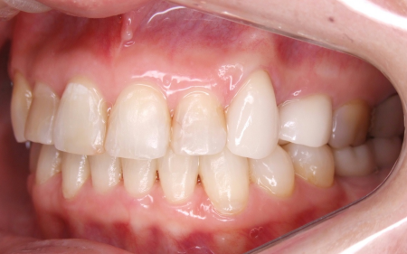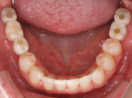 理想的な咬合高径(要素A)・アンテリアガイダンス(要素B)が得られた結果、口元との調和(要素D)も満たされたため矯正装置を外し、固定式のリテーナーを上下の前歯の裏側に装着しました。要素C臼歯の嚙み合わせ治療をインプラント専門医にバトンタッチします。
