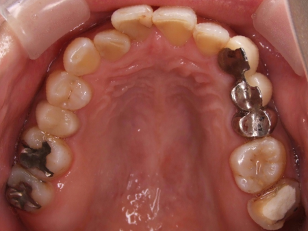 さらに左上の歯(第1小臼歯)の欠損部位は両隣の歯2本(犬歯/3番、第2小臼歯)を土台に人工歯を橋渡しにする被せ物「ブリッジ」が装着されており、お口を開けたときに銀歯が目立つことに加えて、歯の色が全体的に黄ばんでいるため見た目が良くない状態でした。
