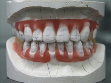 セットアップ模型:患者様の歯型をもとに作製した模型の歯の部分を切りだしてバラバラにしてから理想的な位置に並べ直して、咬合治療のゴールをシミュレーションし、確認するために用います。