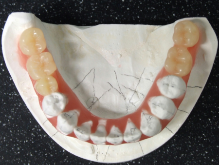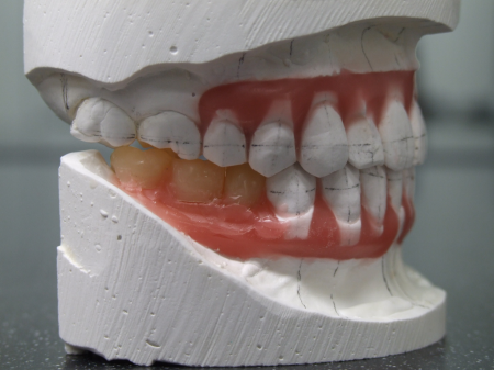 今回のセットアップ模型では咬合挙上による下顎骨のスイングバックがシミュレーションされていません。本来であればフェイスボウトランスファーを行い、平行模型を半調整性の咬合器にマウントしてセットアップ模型を作製し、下顎骨のスイングバックが許容できる範囲をシミュレーションするべきですね。