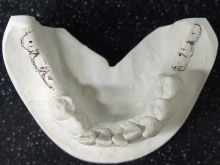 したがって右下前歯を動かさない計画のもと右下前歯の位置を基準としてそれ以外の歯を並べ直して理想的な歯並び、噛み合わせを再現した「セットアップ模型」を製作しました。
